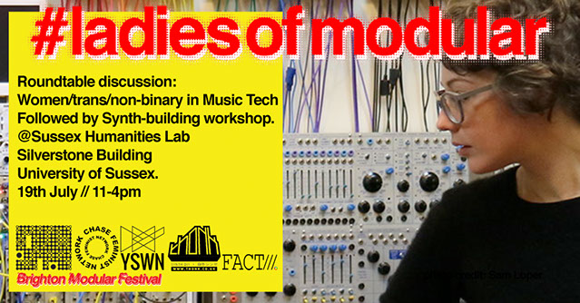 This year we’re dedicating part of Brighton Modular Festival to women, trans-, and non-binary people. Co-funded by the Sussex Humanities Lab and the CHASE Feminist Network, and aided by Thonk, FACT/// and the Yorkshire Sound Women Network, we’re holding a roundtable discussion on women in music tech and a women/trans/non-binary synth-building workshop.